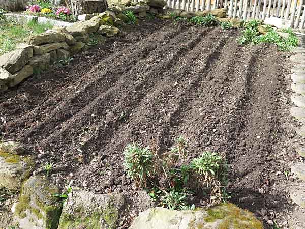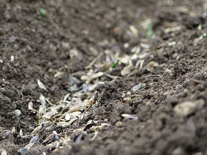 Es wurden dann fast genau vier Wochen, die zwischen den ersten Arbeiten am Beet lagen und der Aussaat. Am 21 März wurden jedoch zunächst mit auf dem Beet verteilten Kuhdung-Pellets Nährstoffe in den Boden gebracht. Im Anschluss wurden fünf Reihen gezogen, in die der Samen gestreut wurde. Anschließend galt es nur noch etwas Erde über die Samenschötchen zu decken, damit der Wind sie nicht fort wehte. Die weitere Arbeit sollte der Frühlingsregen erledigen.