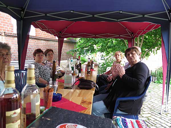 Wie in jedem Jahr gönnen wir uns und unseren Helfern eine kleine Sommerfeier. Für uns, um uns selbst einmal mit ausgestreckten Füßen an einen Tisch zu setzen, ohne Gäste bewirten zu müssen und für unsere Helfer als Dankeschön für ihre Unterstützung bei verschiedenen Vereinsveranstaltungen. Da das Wetter zwar einen trüben Himmel bescherte, aber trotzdem recht milde Temperaturen, hatten wir uns dazu entschlossen, kurz vor dem Fest unsere Faltpavillons aufzustellen, die wir erst kürzlich erworben hatten. In einer Reihe, mit Tischen, Bänken und Stühlen darunter bildeten sie ein gemütliches Dach über uns. Seitenwände waren wegen der Temperaturen nicht notwendig und darum dauerte der Aufbau des Ganzen nur wenige Minuten.