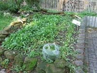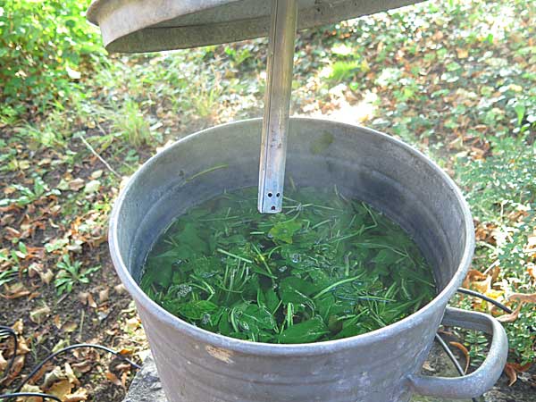Nachdem das Beet abgeerntet war, wurden die Waidblätter gewaschen und "wanderten" im Anschluss in einen Topf, wo sie etwas zerpflückt wurden. Danach kam noch kochendes Wasser dazu und der Deckel oben drauf. Wir bereiteten auf diese Weise zwei Töpfe vor, deren Inhalt jetzt erst einmal auf etwa 60°C abkühlen musste. Bei normalen Umgebungstemperaturen dauerte dies etwa zwei stunden. Diese Zeit braucht der Waid auch um seine Inhaltsstoffe an das Wasser abzugeben.