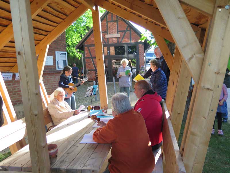 Tische und Stühle standen bereit, wie auch diverse Getränke. Die Bratwurstroste rauchten ebenfalls schon und ein fertig zusammengebautes Insektenhotel als Anschauungsmuster lag auch schon parat als die ersten Gäste kamen. Wir wollten ja auf den Maiveranstaltungen Insektenbehausungen für den Selbstaufbau anbieten, um damit ein bisschen etwas gegen das Insektensterben und den Naturschutz zu tun. Ein entsprechender Artikel war zuvor im "Hockschter Ausrufer" erschienen. Zusätzlich hatte die Bürgermeisterin noch Wildblumensamen und Informationsmaterial von einer Naturschurtzorganisation mitgebracht.