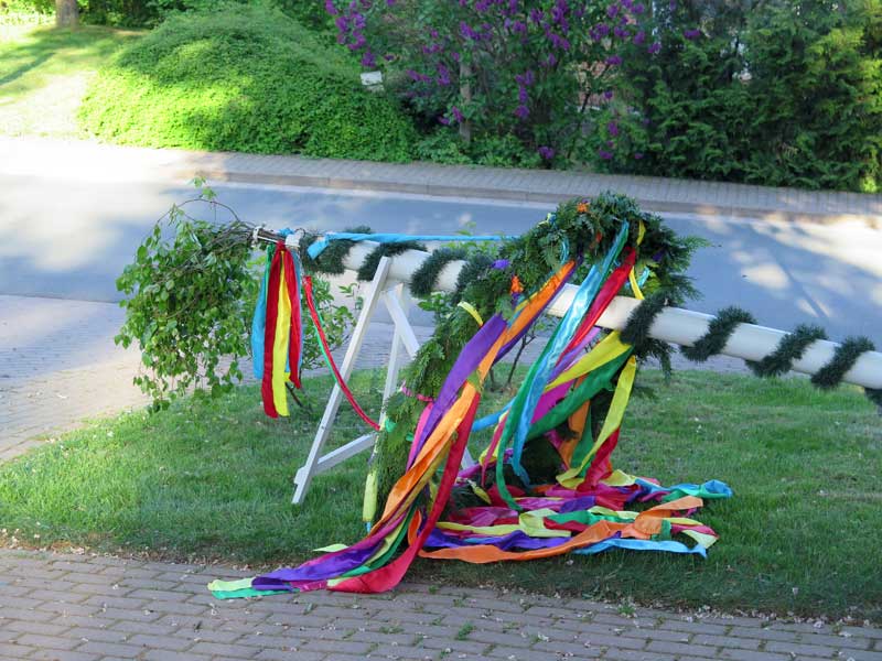 Schnell flatterten die bunten Bänder im Wind und das Geschehen am Bürgerhaus verlagerte sich von vor dem Bürgerhaus nach hinten in den Hof und damit in die Zelte. Bei diversen Getränken und guter Laune feierten wir bis in den Mai. Den Feuerkorb hatten wir diesmal lieber nicht angezündet, da es zu windig war und unsere Zelte bei Funkenflug vermutlich einige Löcher abbekommen hätten. Aber trotzdem war es wieder einmal schön, zusammen die erste öffentliche Bratwurst genießen zu können.