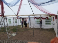 Dazu hatten der Ortsteilrat und die Ortsteilbürgermeisterin alle Hochstedter zu einem Sommertheater ins Waidfestzelt am 28. August eingeladen. Um rechtzeitig fertig zu sein - es galt ja noch das Ganze zu schmücken - wurden die Zelte bereits am 22. August aufgestellt. Einen Tag später wurden dann unsere Organza-Tücher und die Kronleuchter in die Zeltdächer gehangen.