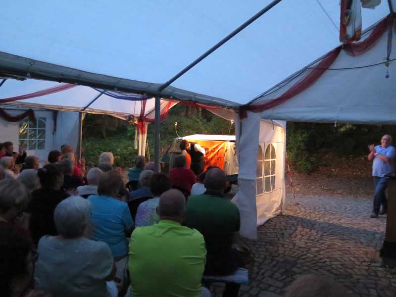 Während im Bürgerhaus alle Theatergäste gebannt der Geschichte, die Kurz zum Besten gab lauschten, war draußen das Zelt Menschenleer. Aber bald strömten alle wieder aus dem Bürgerhaus heraus. Man ließ sich nieder und wartete auf die Fortsetzung des Theaterabends.