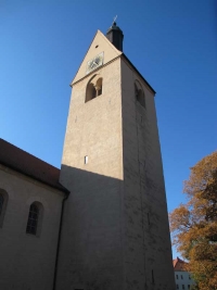 Von dort spazierten wir vorbei an einem kleinen innerstädtischen Weinhang, der von Skulpturen, passend zu den Zaubersprüchen begrenzt wurde. Wir erreichten die Saale und überquerten den Fluss. Hier, am anderen Ufer steht die Kirche St. Thomae, die wir nur von außen betrachteten. Sie gehört zur Straße der Romanik, ist also in dieser Zeit auch errichtet worden, worauf schon das Aussehen des Portals mit dem Rundbogen hinwies. Über die Saale ging es zurück zum Domberg.