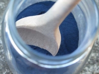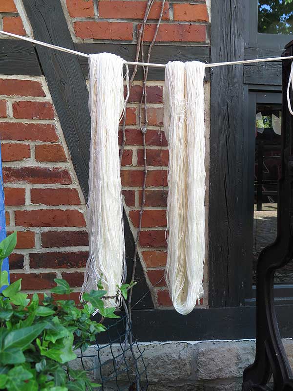 Bisher hatten wir Wolle - sowohl versponnene als auch Rohwolle - gefärbt, sowie Baumwollgarne. Wir kauften also Seidengarn und begannen mit dem Färben. Da unser Waidbeet nicht so viel Blattmasse hervor gebracht hatte, um damit färben zu können, sollte mit Waidpulver gefärbt werden.