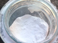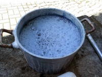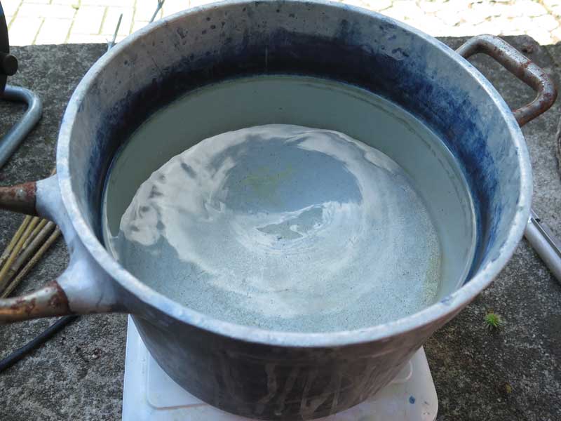 Nachdem die Temperatur etwa 55 °C erreicht hatte kam nun das Waidpulver als erste Zutat unserer Küpe ins Wasser. Wie man ganz gut erkennen kann, ist das Waidpulver, also Indigo, nicht wasserlöslich, dazu braucht es eine weiter Zutat. Wir arbeiten mit Waschsoda - das riecht dann so wunderbar nach Waschküche.