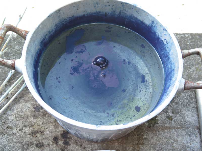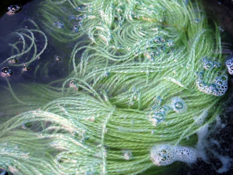Es ist immer wieder erstaunlich wie schnell sich das Färbegut verändert, sobald man es aus der Küpe nimmt und es mit Sauerstoff in Berührung kommt. Der Farbumschlag vom Gelbgrün der Küpe zu einem Blauton läuft wie in einem Zeitraffer-Film ab und geht manchmal so schnell, dass man den Prozess nicht auf Film bannen kann.