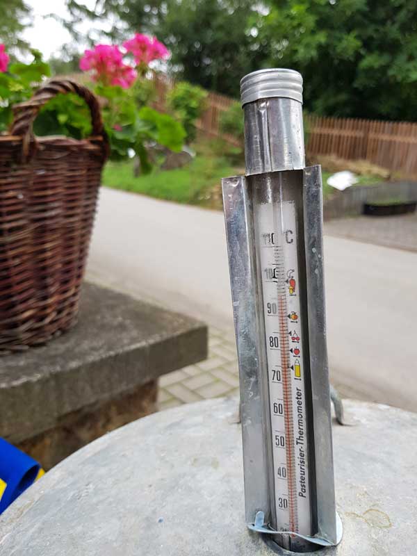 Das mittlerweile kochende Wasser wurde über die gewaschenen und zerstückelten Waidblätter gegossen. Das ganze ruhte nun für zwei Stunden. Während dieser Zeit würden sämtliche Inhaltsstoffe aus den Waidblättern ins Wasser gezogen sein. Es hatte sich nach dieser Ruhezeit auch dunkelbraun gefärbt. Das Wasser konnte nun abgegossen und durch ein Tuch gefiltert werden, wobei sich schon bläulicher Schaum zeigte. Die Blätter waren nun zu nichts mehr zu gebrauchen und wurden hinter dem Waidbeet entsorgt, wo sie sich zersetzen würden.