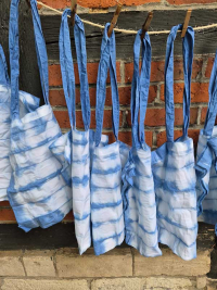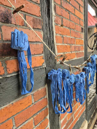 Bis zum Freitag hing das Färbegut zum Bläuen und wurde dann audsgewickelt. Wir waren gespannt auf unsere gefärbten Stoffbeutel, die zum Waidfest angeboten werden sollten. Das Ergebnis konnte sich sehen lassen.