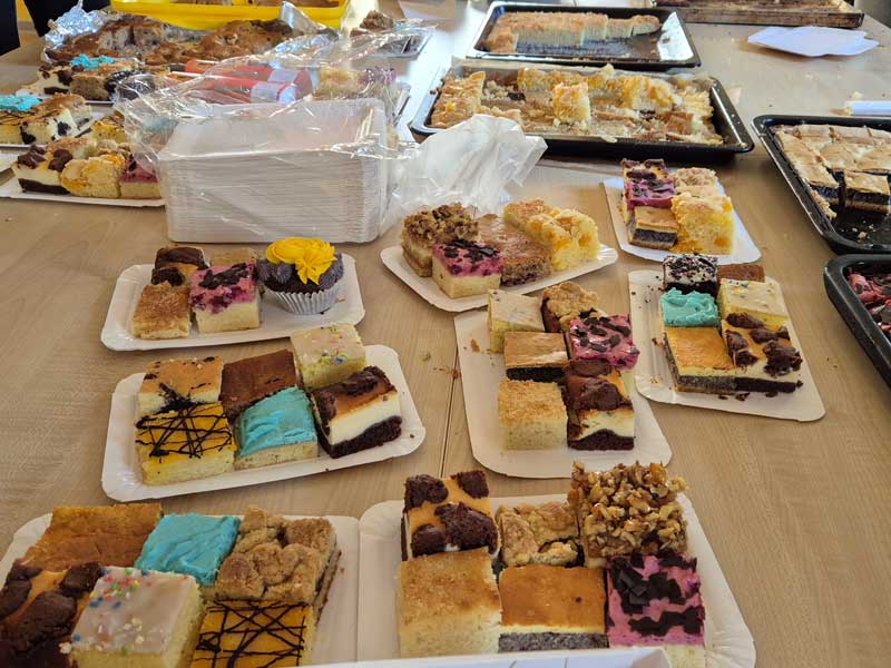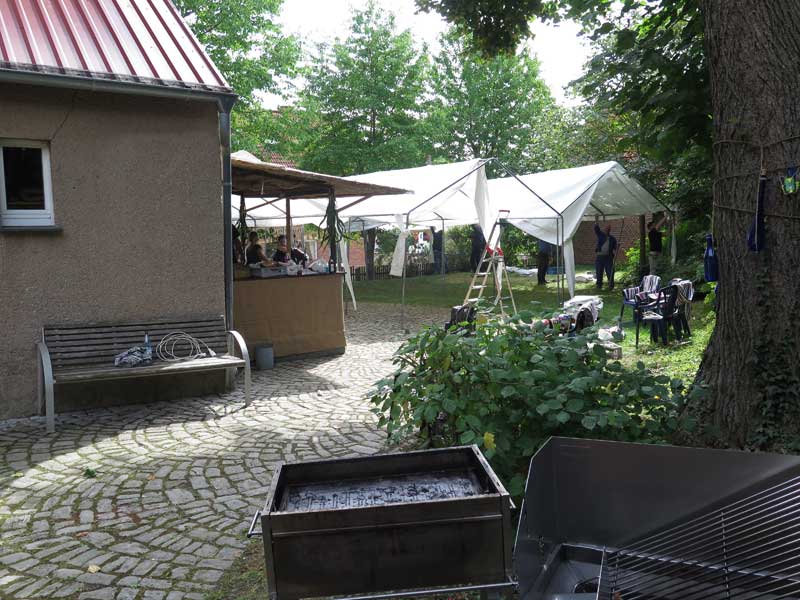 Am Sonnabend, dem Waidfesttag waren auch allerletzte Vorbereitungen für das Waidfest angesagt. So wurden im Bürgerhaus die Kuchen geschnitten und auf Teller verteilt und die Tische im Festzelt geschmückt. Auch der Färberstand am Museum wurde jetzt eingeräumt und die Bastelstation für die Hochstedter Knirpse. Das Wetter spielte mit und die Sonne strahlte vom Himmel.
