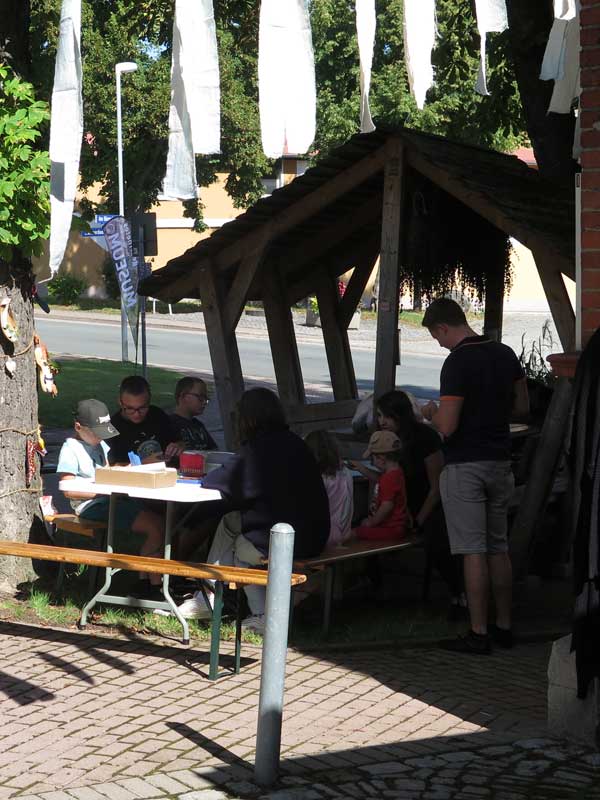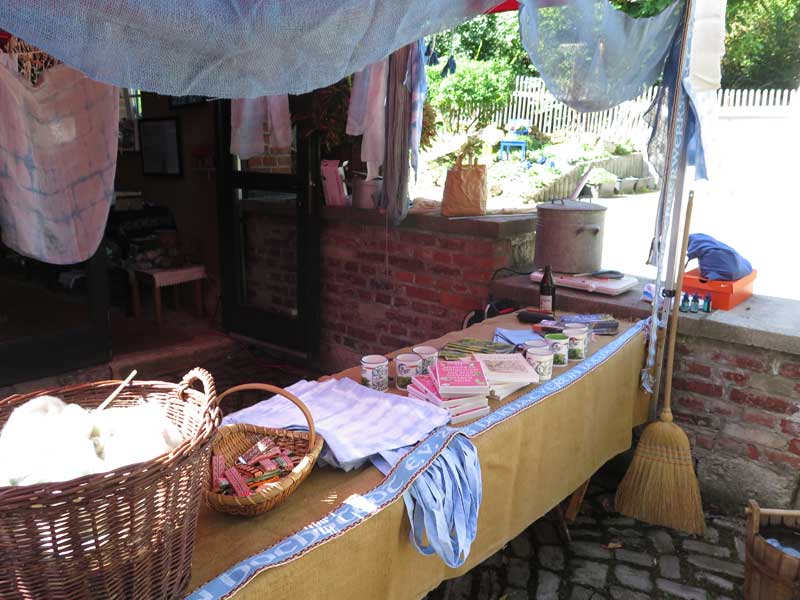 Der Sonntag nach dem Waidfest stand im Zeichen des Rückbaues. Alles das, was in den Tagen zuvor aufgebaut worden war, musste nun abgebaut, in Kisten verpackt und dann untergebracht werden. Erstaunlich dabei ist immer, dass der Abbau sehr viel schneller geht. Innerhalb weniger Stunden war der Hof des Bürgerhauses aufgeräumt und auch vor dem Museum war vom Färberstand nichts mehr zu sehen.