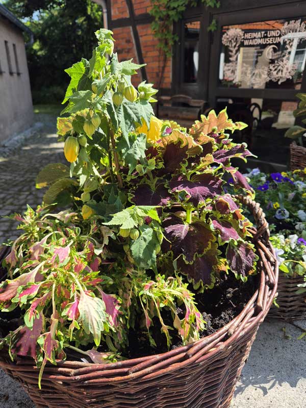 Die Sommerbepflanzung des Jahres am Museum in unseren Pflanzkörben war Mitte Juni in der Planung und wurde am 21. des Monats ausgeführt. Diesmal hatten wir uns eine etwas andere Bepflanzung ausgedacht, nachdem die vom Vorjahr einer Horde marodierender Spatzen zum Opfer gefallen war, denen der Mangold vorzüglich geschmeckt haben muss.