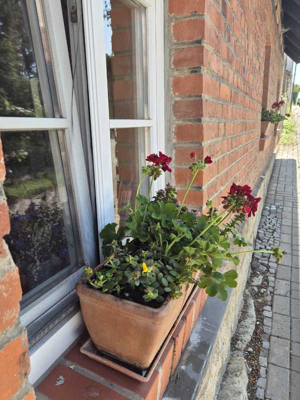 In die Kästen der Fensternischen wurden Geranien und Portulak gepflanzt.