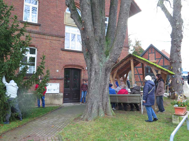 Mit dem 29. November war wieder der der Tag herangerückt, an dem es darum ging den Hochstedter Weihnachtsbaum aufzustellen und zu schmücken. Selbstverständlich geht die gesamte Aktion nicht ohne einen Glühwein oder ein Leberwurstbrot vonstatten. Zunächst musste jedoch der Baum gefällt und herangeschafft werden. Als Weihnachtsbaum würde von der Tanne nur der obere Teil zum Einsatz kommen.Â