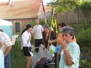 Großes Hallo gab es, als die Abordnung der "Schmette" im Hof einzog. Mit Tröten und Energieblitzen zeigten sie, dass ihre Straße unter Spannung steht. Noch mehr, wenn die neue 380 kV-Leitung gebaut werden sollte.
