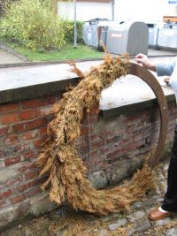 Eine weitere Aufgabe bestand darin, den im Museum über den Winter eingelagerten Maikranz abzuschmücken. Schon wenige Tage später soll er nämlich neu, mit frischem Grün und bunten Bändern geschmückt werden. Der Museumsputz zieht sich immer über den gesamten Vormittag hin und endet bei einer Flasche Bier, damit auch die Geselligkeit b