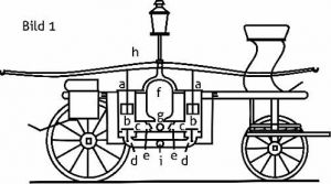 Das Pumpwerk besteht im Prinzip (Bild. ) aus den Zylindern (a), den Kolben nebst Kolbenstangen (b), den Gurgelröhren (c), Saugventilen (d), den Druckventilen (e), dem Windkessel (f), dem Ausgussrohr (g), dem Druckhebel (h) und dem mit einem Gewinde zum Anschrauben eines Saugschlauchs versehenen Saugrohr (i).