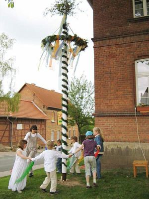 Unmittelbar nachdem der Baum stand und die Bänder am Kranz wehten, sangen die Hochstedter Knirpse über den Frühling und über den Mai.