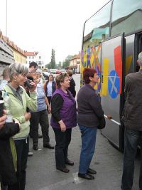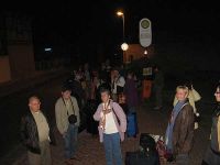Der kam jedoch aus der anderen als von uns gedachten Richtung, nämlich von Mönchenholzhausen und nicht über Vieselbach, und musste deshalb zunächst an uns vorbei nach Vieselbach fahren, um dort die Mitreisenden einzusammeln, die an zwei Zustiegen mit ihrem Gepäck warteten. Während in Hochstedt Geduld gezeigt wurde, stiegen die ersten sieben Reisenden in Vieselbach zu. Wenige Minuten später war auch der größte Teil der Reisegruppe von Hochstedt dabei in den Bus zu steigen, während das Gepäck im Bauch des Busses verstaut wurde. Mit etwa vierzigminütiger Verspätung ging es dann los in Richtung Autonbahn 4.
