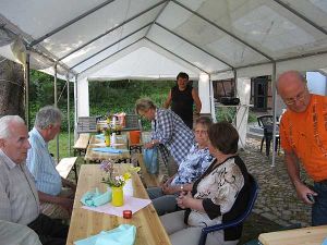 In der Mitte der Zelte stand ein großer Sommerblumenstrauß und auf den Tischen kleine Sträußchen. Schon im Mai waren Einladungen an Nicht-Vereinsmitglieder herausgegangen, da wir uns auf diesem Weg für ihre Hilfe bedanken wollten.