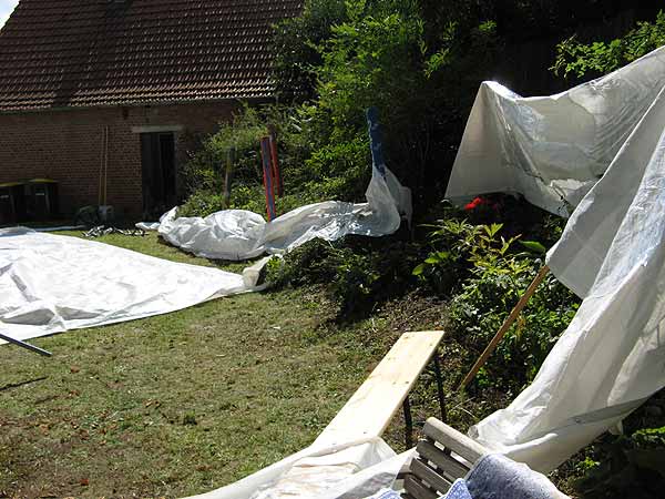 Hauswand des Bürgerhauses und den Stamm der Kastanie passen. Das klingt jetzt zwar relativ kompliziert, war es aber nicht - oder doch? Beide Zelte standen irgendwann richtig und mit geraden Seitenwänden nebeneinander. Wir waren zufrieden. Probleme bildete dann das dritte Zelt, das wo jetzt die flachen Giebelwinkel des Achter-Zeltes eingearbeitet werden mussten. Am Ende des Aufbau-Prozesses war der rückwärtige Teil dieses Zeltes breiter als der vordere, weil eben dort die flacheren Winkel als Seitenwinkel eingefügt waren.