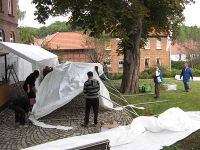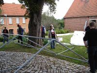 Hauswand des Bürgerhauses und den Stamm der Kastanie passen. Das klingt jetzt zwar relativ kompliziert, war es aber nicht - oder doch? Beide Zelte standen irgendwann richtig und mit geraden Seitenwänden nebeneinander. Wir waren zufrieden. Probleme bildete dann das dritte Zelt, das wo jetzt die flachen Giebelwinkel des Achter-Zeltes eingearbeitet werden mussten. Am Ende des Aufbau-Prozesses war der rückwärtige Teil dieses Zeltes breiter als der vordere, weil eben dort die flacheren Winkel als Seitenwinkel eingefügt waren.