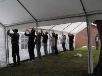 Der Aufbau der Zelte für das Waidfest erfolgte ab dem 1. September. Der Wetterdienst hatte für die kommenden Tage Regenschauer angesagt und wir wollten, dass zumindest der Boden - der ja zum Teil aus Grasfläche besteht - einigermaßen trocken war. Was eigentlich mittlerweile Routine sein sollte - der Zeltaufbau - entpuppte sich doch als relativ schwierig. Das Problem lag einfach darin, dass unser Acht-Meter-Zelt schräge Zeltwände aufwies, die durch die Giebel-Winkel hervorgerufen wurden. Diese flacheren Winkel sollten durch gekrümmtere vom Zehn-Meter-Zelt ersetzt werden. Damit würden Achter- und Zehnerzelt nebeineinander zwischen