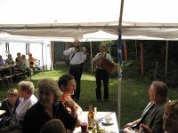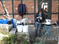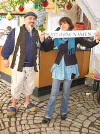 Frau Minelli hatte unterdessen am Museum ihre kleine Färberwerkstatt aufgebaut und zermahlte das Waidpulver für den Färbeprozess. Das Waidfest hatte unterdessen schon den nächsten Programmpunkt erreicht. Das Duo Liedfass nahm Aufstellung, um mit "Zerrwanst" (Akkordeon) und Geige das Publikum zum Mitsingen und Mitschunkeln zu animieren.