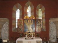 Dazwischen waren Gedenktafeln aus Porzellan angebracht, die die Namen der im ersten Weltkrieg gefallenen trugen. Unterbrochen wurden die Namenstafeln durch Kinderköpfe, die verschiedenartig ausmodelliert und untereinander angebracht waren. Auch der romanische Türbogen, der beide Kirchenräume miteinander verband war mit Porzellan verkleidet. Im Altarraum aren Reste der frühgotischen Wandmalerein erhalten, wie auch Steinfiguren über der Tür zur Kapelle. In dem kleinen Kapellenraum hatte die Porzellanmanufaktur eine eigene - ebenfalls aus Porzellen gefertigte - Gedenktafel zum Andenken an die gefallenen Mitarbeiter aufgestellt.