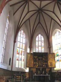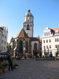 Wir umrundeten durch eine kleine Gasse die Frauenkirche und betraten das Gebäude. Bei der Frauenkirche handelte es sich um einen gotischen Hallenbau, der 1457 geweiht wurde. Der Flügelaltar zeigte die Marienkrönung und die Grablegung Christi. Über uns war ein Kreuzgewölbe zu sehen und auf der dem Altarraum gegenüber liegenden Empore eine Orgel. Die Besonderheit der Kirche befand sich jedoch im Turm. Wir hatten auf dem Markt bereits eine Kostprobe vom Glockenspiel der Frauenkirche zu hören bekommen. Die Glocken stellten eine Besonderheit dar, waren sie doch aus Meißner Porzellan hergestellt. Täglich erklingen zu verschiedenen Tageszeiten sechs verschiedene Choräle.