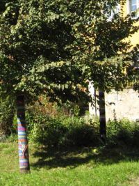 Eigentümlich war hier dass die Stämme der Bäume, die dort standen mit Wolle bestrickt waren, als hätte man ihnen Strümpfe angezogen.