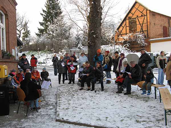 Ganz so lange hielten es die Hochstedter jedoch nicht im Freien aus, denn es wurde bitter kalt und das Weihnachtsbaumsetzen  fand sein Ende. Nur der Baum, der blieb stehen wo er hingestellt und geschmückt worden war.