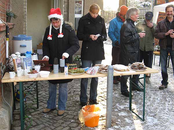 Dort war man schon mit dem Errichten eines kleinen Pavillons beschäftigt und damit, den Glühweintopf in Gang zu bekommen.