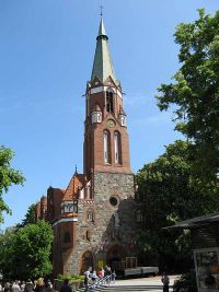 Etwa auf der Hälfte der Strecke blieben wir im Schatten stehen und betrachteten die dort stehende Kirche des heiligen Georg. Jan Klatt erklärte, dass das Gotteshaus zu Beginn des 20. Jahrhunderts von Kaiser Wilhelm II. finanziert wurde, nachdem er den Entwurf selbst genehmigt hatte. Der Kaiser war mit seiner Frau Augusta Viktoria nach der Fertigstellung im Jahr 1901 zur zeremoniellen Einweihung in das damalige Zoppot gekommen.