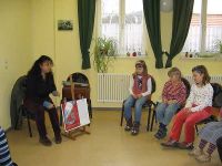 Die elf Kinder nahmen gespannt auf den Stühlen Platz, die rund um eine Staffelei angeordnet waren und warteten auf den Beginn der Geschichte.