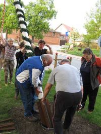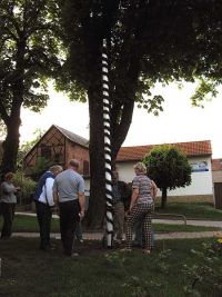 Am unteren Ende des Maibaumes waren Verstärkungen angebracht worden, um den Baum mit kleineren Keilen einklemmen zu können.