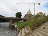 Diese Treppenstufen endeten im Wasser der Mulde, die - für uns erstaunlich - ziemlich breit und träge an uns vorüber floss. Rechts neben uns war eine Baustelle zu sehen, wo ein Brückenneubau den Fluss überspannte. Dahinter wurde ebenfalls gewerkelt, nämlich an einem augenscheinlich alten Gebäude. Entgegen unseren Befürchtungen hielt das Wetter bisher den Prognosen stand und sogar blauer Himmel wölbte sich über uns. Da die Stadtführung um 9.30 Uhr beginnen sollte stiegen wir die Stufen vom Mulde-Ufer wieder hinauf.