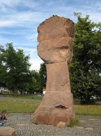 Etwas abseits der Treppe war ein eigentümliches Gebilde zu sehen. Ein rötlicher aus Naturstein bestehender Koloss erhob sich vor uns. Wir rätselten nicht lange über den Sinn dieses Denkmals, denn um ein solches handelte es sich. Ziemlich weit oben war eine blau gefärbte Kerbe zu sehen, die den Hochwasserstand im Sommer des Jahres 2002 markierte.