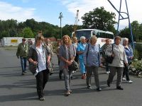 Bei dem Denkmal handelte es sich um einen steinernen Baum. Wir waren beeindruckt über das Ausmaß der Flut und konnten uns jetzt erklären, warum rings um uns herum gebaut wurde. Die Flut-Schäden waren noch immer nicht beseitigt. Wieder am Bus angelangt, traf auch unsere Stadtführerin ein, die uns herzlich begrüßte. Kurz darauf begannen wir unseren Weg durch die Stadt Grimma.