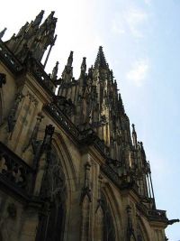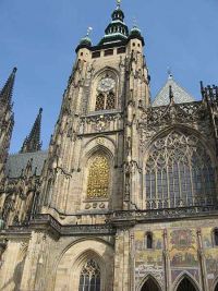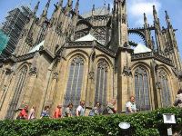 Ein schmaler Durchgang brachte uns zum dritten Burghof, der geprägt war, durch den hoch aufragenden Veits-Dom. Wir erfuhren, dass mit dem Bau der gothischen Kathedrale im Jahre 1344 unter Karl IV. auf den Mauern eines Vorgängerbaues begonnen wurde. Wie bei so vielen große Kirchenbauten wurde sehr lange daran gearbeitet, so dass der Dom erst zu zu Beginn des 20. Jh. fertiggestellt wurde. Der Dom stellte mit seinen Abmessungen - 124 Meter Länge, 60 Meter Breite (Querschiff), 33 Meter Höhe (Mittelschiff) - gleichzeitig die größte Kirche in Prag dar.