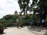 Der Weg zum Zugang der Burg führte uns an einem Garten vorbei, den wir später besichtigen wollten. Dabei handelte es sich um einen Garten, der erst seit dem politischen Umbruch, zu Beginn der 1990er Jahre zugänglich ist. Vorher war der Weg wegen der Präsidentenvilla, die im Zentrum des Parks stand für das Volk versperrt. Denise zeigte uns unterwegs Fassaden, die auf ganz besondere weise verziert waren, indem man in den Putz Ornamente kratzte. Die Sonne brannte nun immer stärker vom Himmel und Denise meinte, dass sie in den Sommermonaten nicht gerne Führungen hier oben machen würde, weil es zu heiß sei.