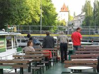 Da wir nicht genau wussten, wo unser Schiff lag, mit dem wir die Moldau befahren wollten, ging eine Vorhut Ausschau halten. Es waren wirklich nur noch einige Meter bis das Ziel erreicht war. Unser Schiff war die grün-weiße Taurus, die an der Uferterrasse vor Anker lag. Wir mussten nur noch ein wenig warten, denn wir waren entschieden zu früh angekommen. Die Fahrt sollte erst um 18.00 Uhr beginnen.