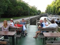 Zwischendurch verschwanden wir wieder vom Oberdeck und setzten uns zum Essen wieder in die Wärme des Schiffsbauches. Wir konnten den Schiffskoch nur loben, die Speisen waren wirklich vom Feinsten. Jedoch lange hielt es uns nicht hier unten und wir nahmen unsere Getränke mit nach oben. Inzwischen hatten wir eine Schleuse erreicht, um den Höhenunterschied des Wehrs auszugleichen. Das Füllen der Schleuse dauerte seine Zeit und wir sahen rechts und links nur Steinwände, an denen wir uns langsam nach oben schraubten.