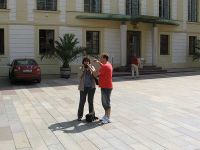 Im Zentrum des zweiten Burghofs, dem wir vorher schon einen Besuch abgestattet hatten, stand auf einem etwas erhöhten Podest aus Stufen ein Brunnen. Hier, erklärte Denise, werden traditionell die Gruppenfotos geknipst. Wie schon im letzten Jahr in Polen gab es für die Aushilfsfotografin (Denise) zunächst eine Einweisung am Fotoapparat.