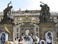 Nachdem das Bild im Kasten war ging es weiter zum Hauptportal der Burg. Dabei kamen wir an der Treppe vorbei, wo bei Staatsbesuchen grundsätzllich die berühmten Staats-Treppenfotos gemacht werden. Die Stufen führten hinauf zu den Repräsentationssälen. Hier befand sich auch die Wohnung des Präsidenten der Tschechischen Republik. Nachdem wir das Treppenhaus verlassen hatten gelangten wir auf den ersten Burghof, umsäumt von einem hohen, schmiedeeisernen Zaun. Das Tor mit den großen Statuen der kämpfenden Giganten auf den beiden Säulen lag direkt gegenüber.