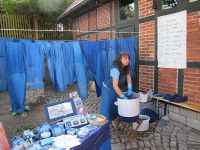 Auch für die kleinen Gäste war gesorgt, die sich wieder mit kreativen Dingen beschäftigen konnten. Diesmal galt es alte Schuhe (ahle Schlumpen, wie die Hochstedter sagen) bunt zu bemalen. Diese waren nicht dazu gedacht wieder getragen zu werden, sondern in ihnen sollte Waid wachsen. Gegenüber, neben dem Museum, war Rosanna Minelli dabei Seidentücher blau zu färben. auf der Leine hingen schon einige zum Trocknen.
