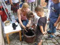 Der Waidbauer war unterdessen noch immer mit dem Färben der Wollestränge beschäftigt, deren Blautöne mit jedem Tauchgang in die Färbeküpe immer intensiver wurden. Während die Theke wegen des warmen Wetters regen Zulauf hatte, verabschiedeten sich die Rohrborner und wünschten uns noch ein schönes Fest.