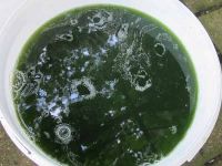 Einen Farbumschag in blau gab es bei diesem Kaltversuch nicht. allerdings färbte die Waidbrühe ein helles Lindgrün und bereicherte damit den Farbumfang der Wollestränge, die heiß gefärbt worden waren. Einer der kalt gefärbten Stränge wurde noch einmal mit der anderen Methode gefärbt, was einen graublauen Ton ergab. Die kalte Waidbrühe wurde zwei Tage später erhitzt und mit Natron sowie Natriumhydrosulfit versetzt, um damit etwas Rohwolle zu färben. Dieser Versuch ergab ein Graublau. Auch diese Wolle kam ins Museum, wo sie mit einer Handspindel ausgestellt zu besichtigen ist.
