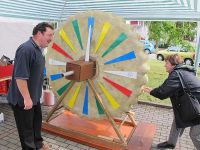 Im Anschluss machten wir uns, nach einer Stärkung bei Kaffee und Kuchen, auf den Weg, um unser Glück beim Spiel zu versuchen. In Rohrborn drehte sich das Glücksspiel selbstredend um Waidmühlräder. Zum einen gab es da das Glücksrad, welches nach dem Dreh eine Farbe anzeigen musste, damit man einen Preis einheimsen konnte, zum anderen gab es das Waidstein-Weitrollen. Bei beiden Wettbewerben traten wir an und wie sich später zeigen sollte nicht ganz umsonst. Stolz wurden die Preise nach dem Glückswaidsteindrehen vorgezeigt, die in jeweils schwarzen Siegerbeuteln ruhten.