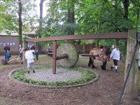 Zurück auf dem Festplatz waren die Rohrborner gerade dabei die Waidmühle in Bewegung zu versetzen. Die Waidernte lag auf der Tenne und wurde von den gezackten Zähnen des Mühlsteins zu Mus zerquetscht. Ein Gehilfe mit der Harke sorgte dafür, dass die Pflanzenblätter immer wieder unter der Last des Steines zu liegen kamen. Nachdem der Stein sein Werk verrichtet hatte setzten sich die Rohrborner Frauen an den Rand der Mühle und formten mit ihren Händen Waidballen, die sie auf die Horde zum Trocknen legten.